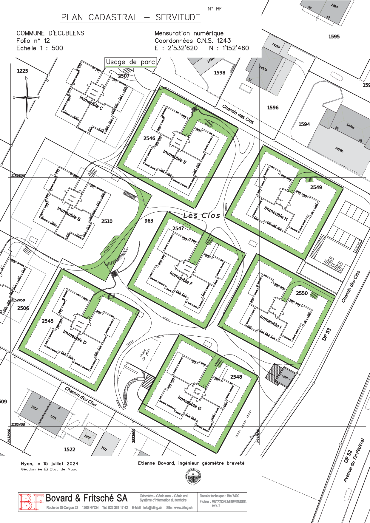 Division de la parcelle de base en 10 nouveaux biens-fonds à savoir une pour chacun des immeubles en PPE et une pour le parc en copropriété.